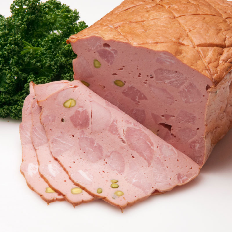 豚・牛肉でつくった生地に、塩漬けにした豚もも肉の角切りとピスタチオが入っており、オーブンでじっくり焼き上げた型焼きソーセージです。